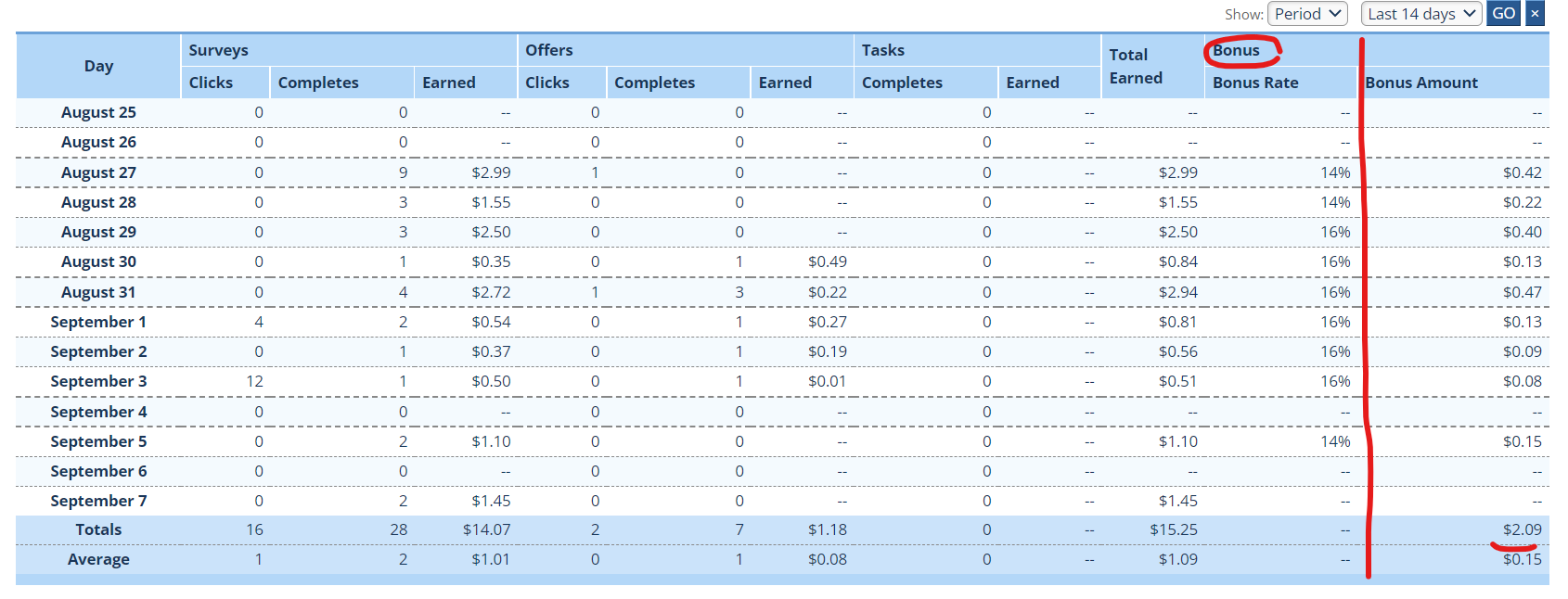 저의 보너스 현황을 보시면 3일 내내 한 날은 최대 보너스 포인트 +2%가 더해져서