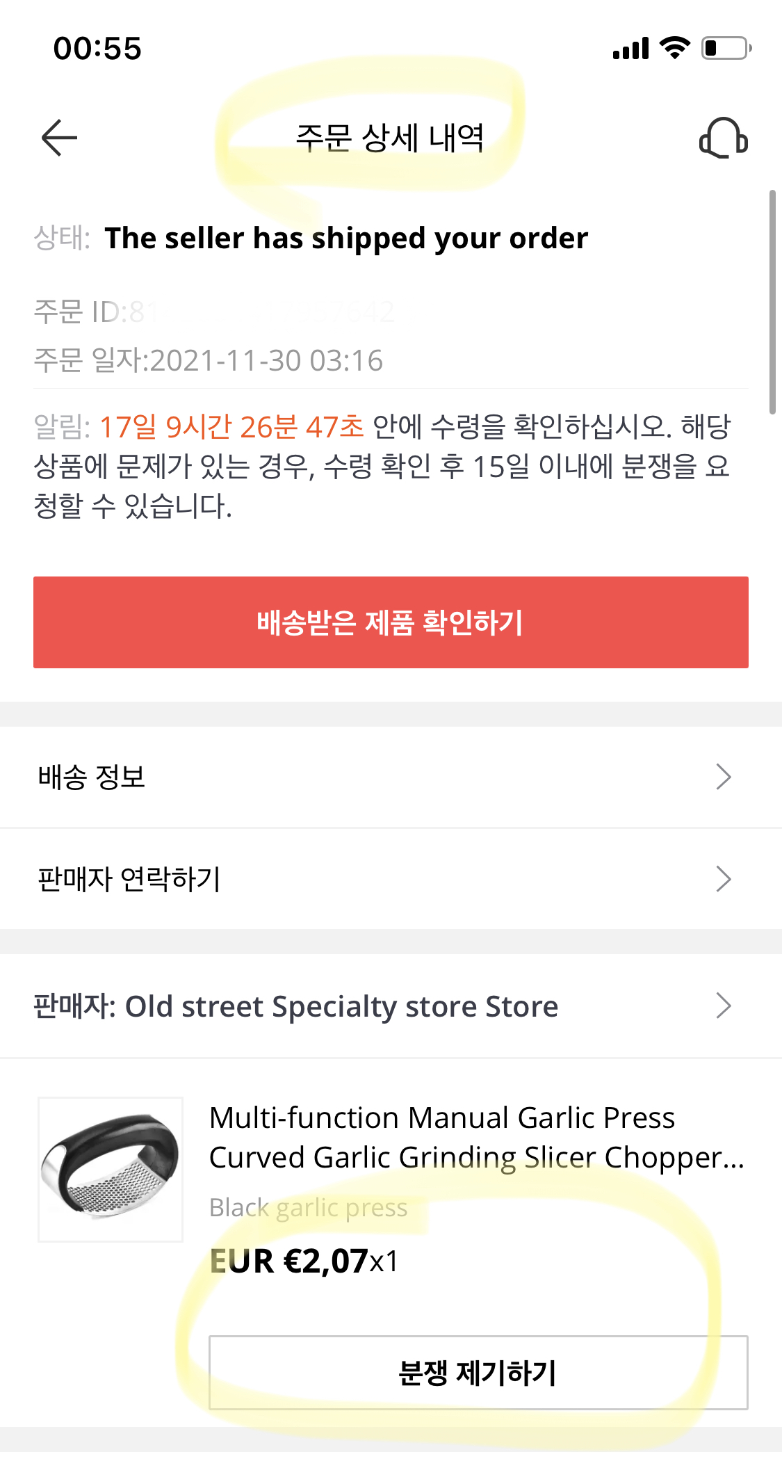 1. 주문 상세 내역 에 들어가 분쟁을 제기하고 싶은 상품을 찾아 아래 분쟁 제기하기 클릭
