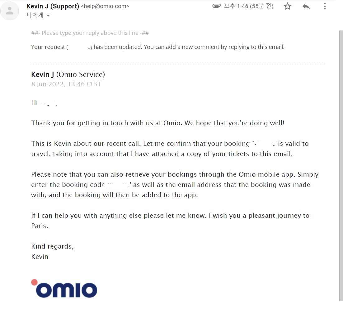 사실 구글에 omio쳤다가 그지같다는 리뷰를 많이봐서 과연 연락이 될까 싶었는데