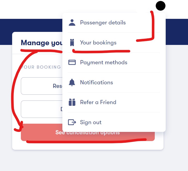 오른쪽 상단의 내프로필->your bookings누르면 내가 예약한 여정들과 see cancellation options이 있는데
