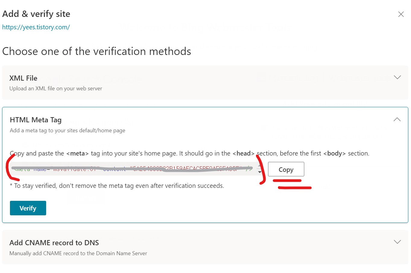8. 다시 빙웹마스터로 돌아와 Verify 해줍니다!