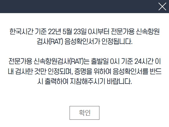 - 전문가용 항원검사 : 출발일 0시 기준 24시간(1일)이내 검사