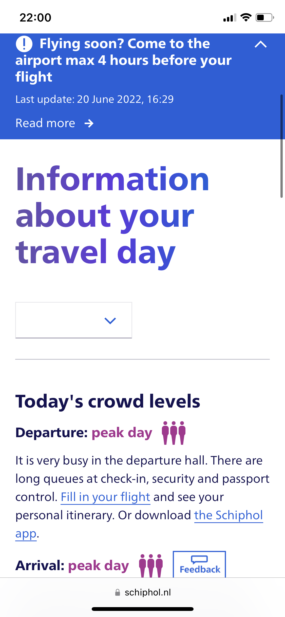 See how busy we expect Schiphol to be on your travel date, with up-to-date info like traffic, queues and other details that may impact your journey.