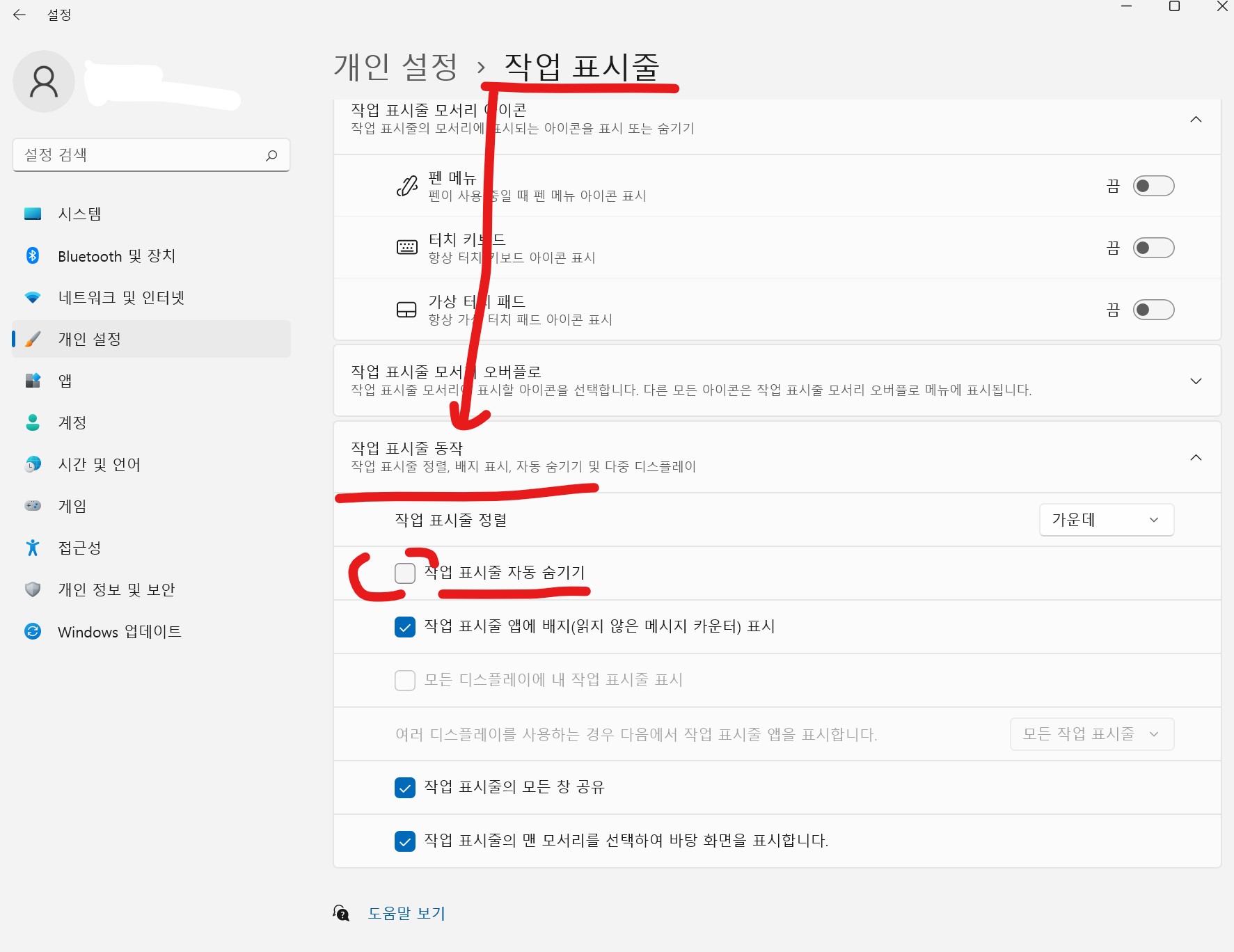 -> 작업표시줄 동작 -> 작업 표시줄 자동 숨기기 체크 해제