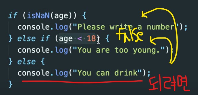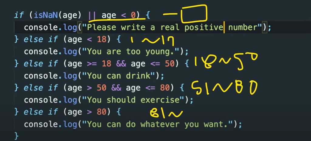 * isNaN(age) ll age <0 : 텍스트 혹은 -124 중 하나만 true여도 실행됨
