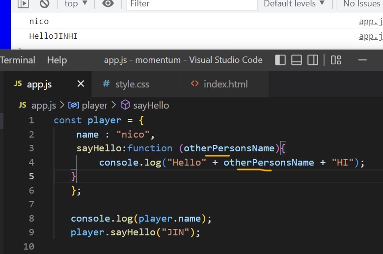 console.log("hello" + "nico");