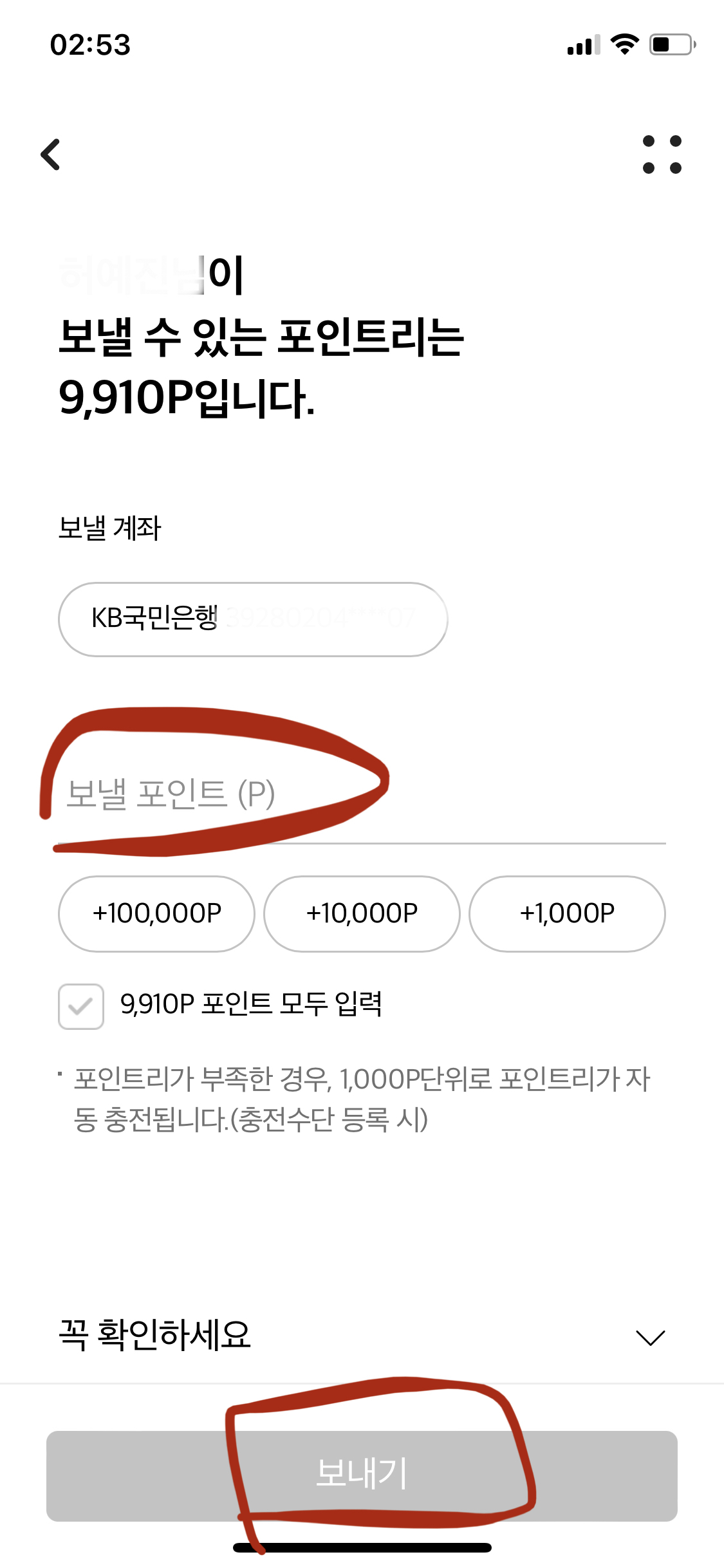 7) 보낼 포인트 입력 -> 보내기