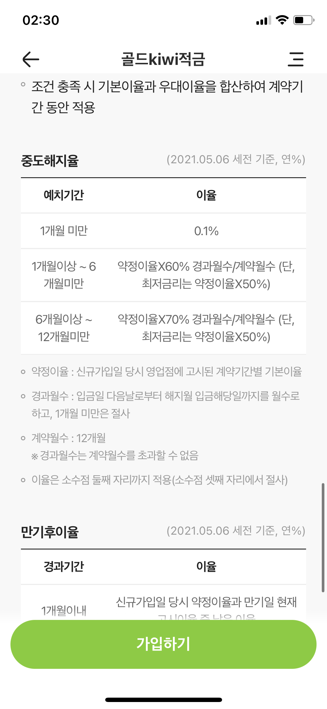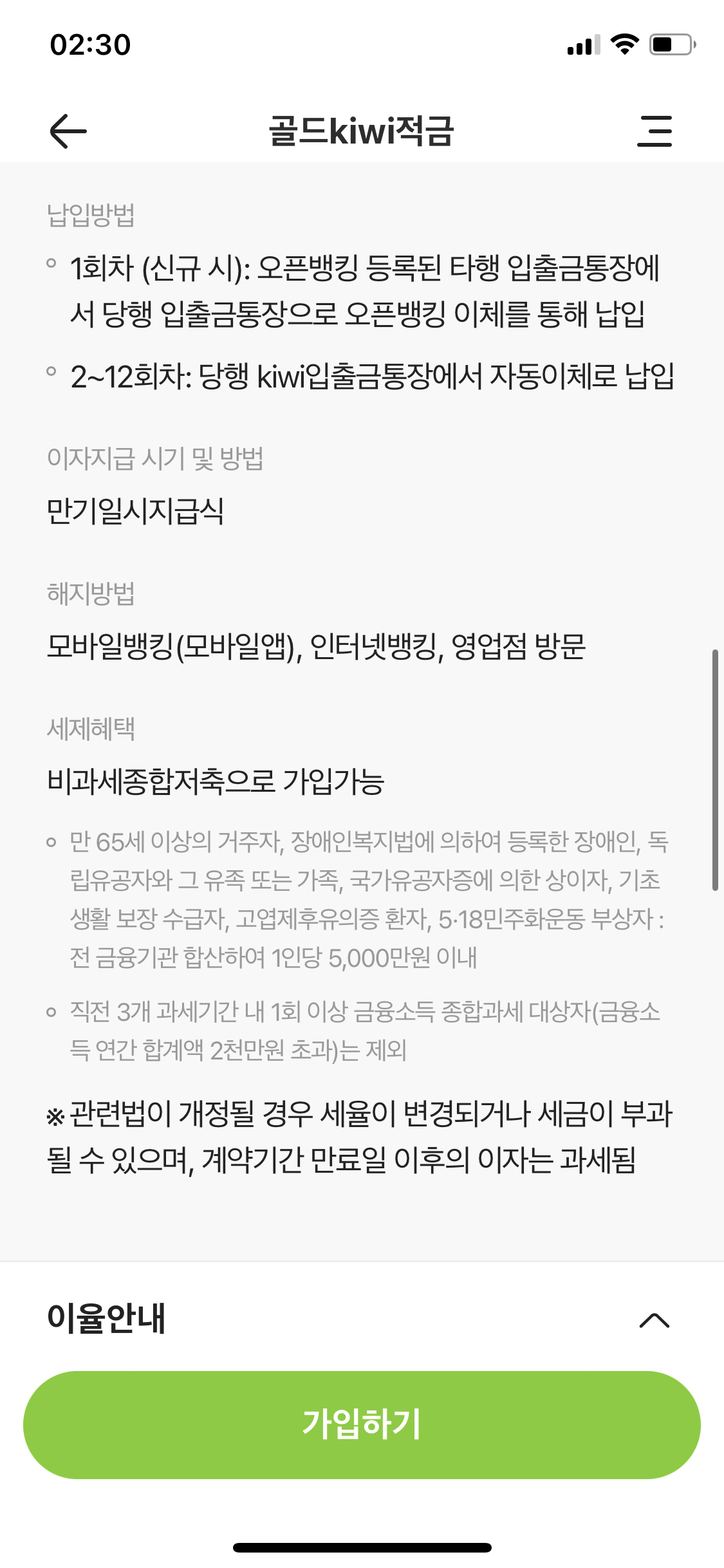 아래는 키위뱅크 골드Kivi적금 화면입니다.