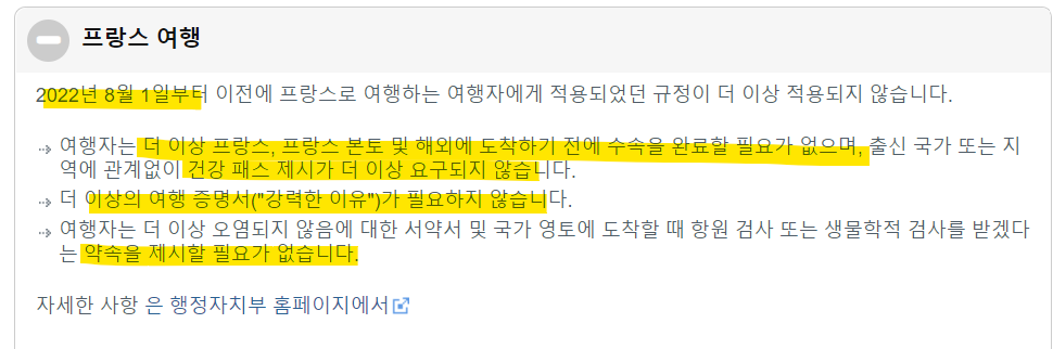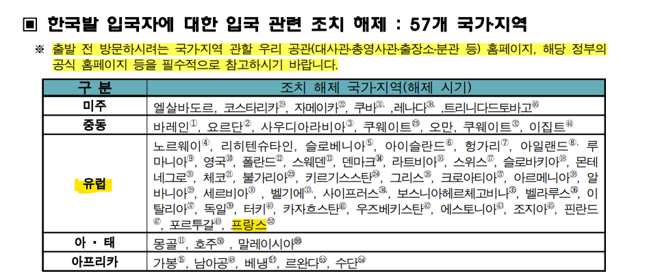 한국 -> 프랑스 입국 시 규정
