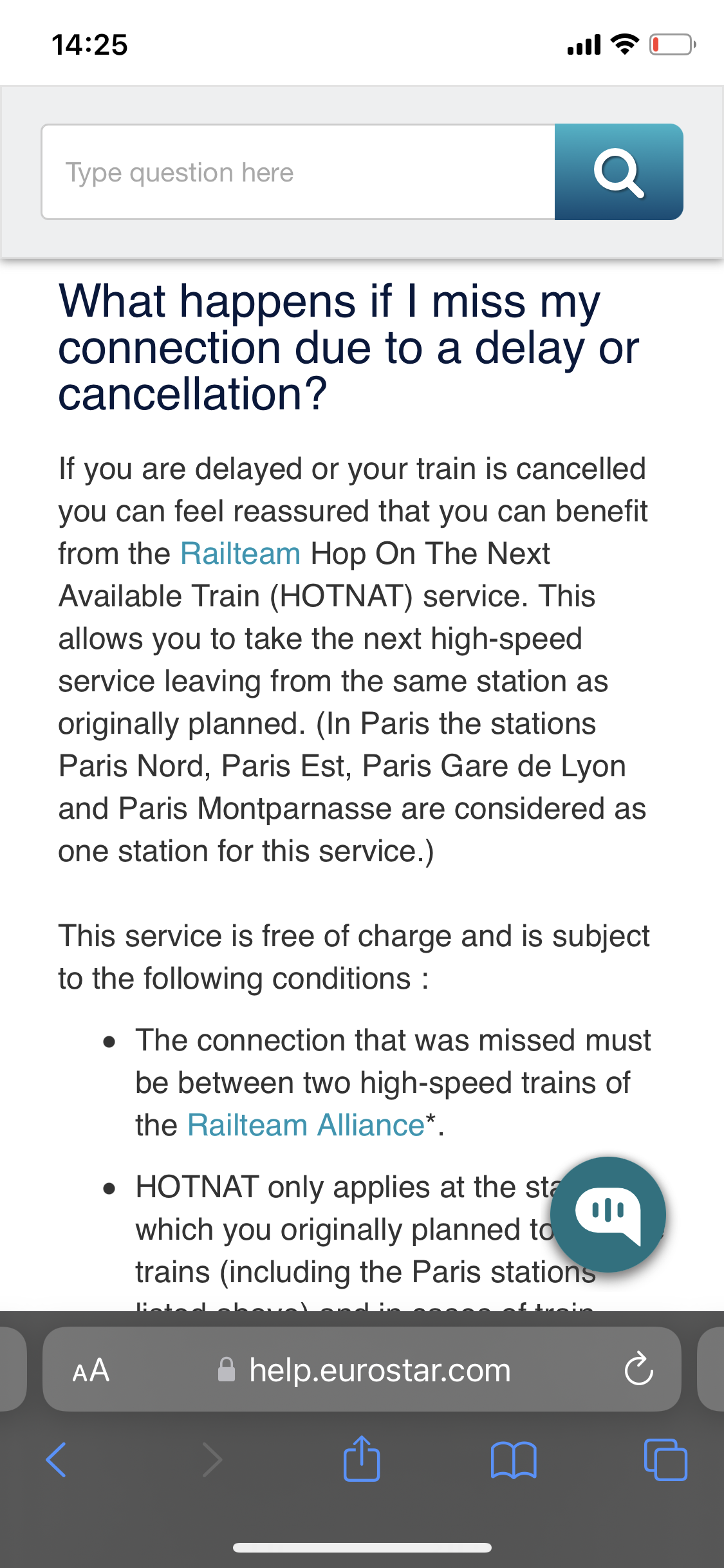 If you are delayed or your train is cancelled you can feel reassured that you can benefit from the Railteam Hop On The Next Available Train (HOTNAT) service. This allows you to take the next high-speed service leaving from the same station as originally pl