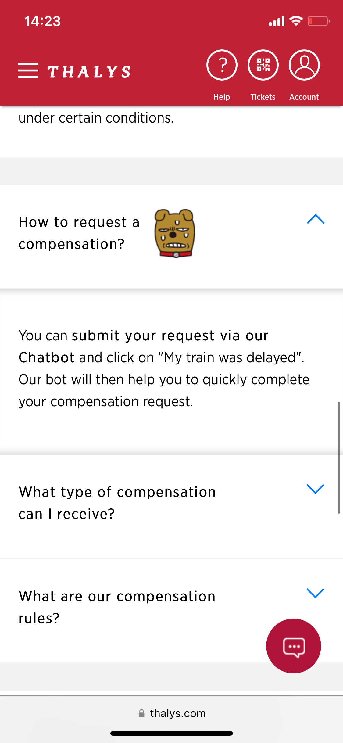 3. 보상 어떻게 받을 수 있어? : 챗봇열고(오른쪽하단) -> "My train was delayed" 클릭