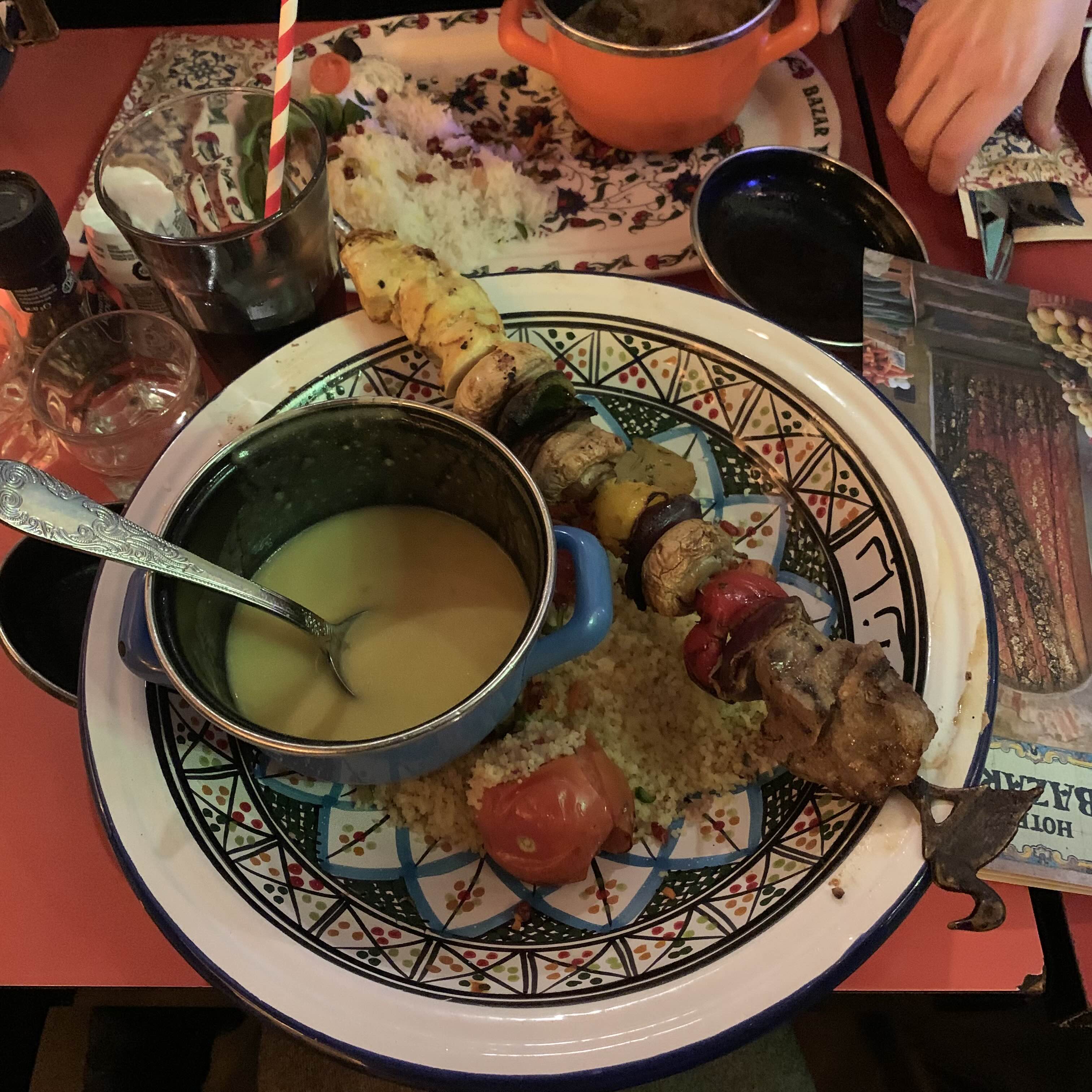 송아지 고기, 닭고기, 야채를 곁들인 구운 엘 쿠스쿠스(고기) 케밥