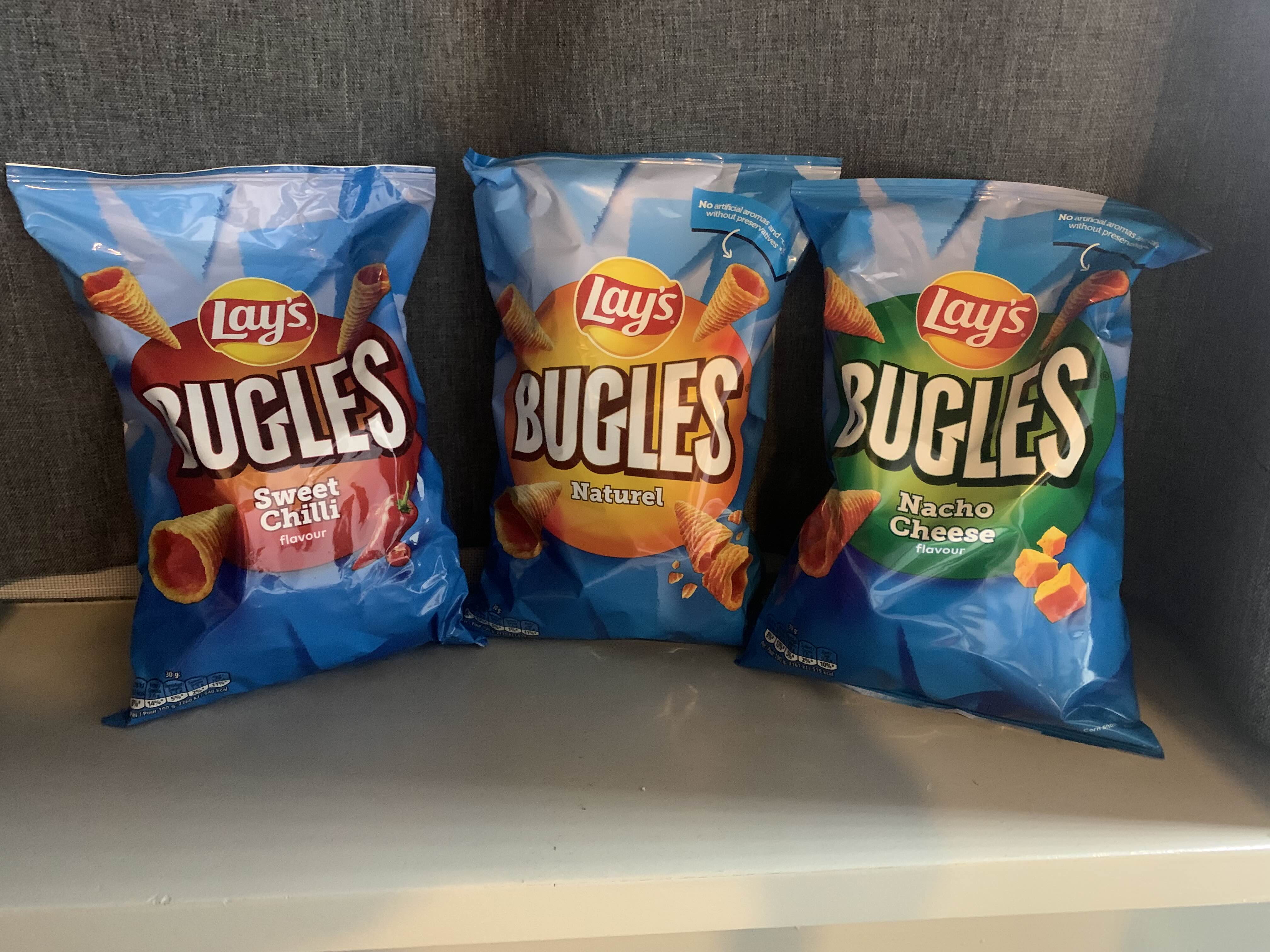 Lays Bugles는 Lays 과자 브랜드의 일종으로, 길쭉하고 곡선 모양의 감자칩입니다. 이 과자는 혀 모양에 영감을 받아 만들어졌으며, 크기와 모양이 다양하여 고객들이 선택할 수 있는 다양한 옵션이 있습니다.