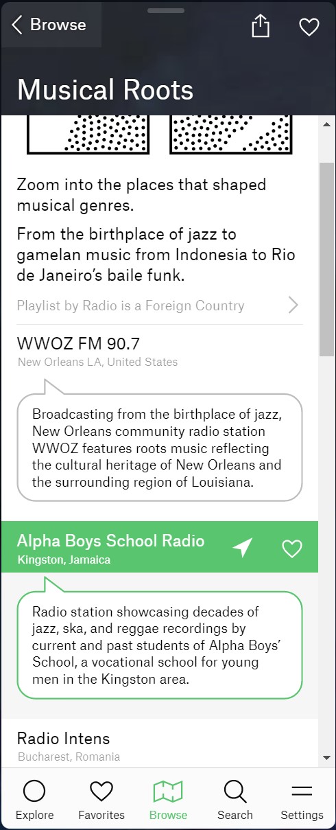 예를들어 뮤직루트 > 음악 장르를 형성한 장소를 확대합니다. 재즈의 발상지부터 인도네시아의 가믈란 음악, 리우데자네이루의 베일 펑크까지.