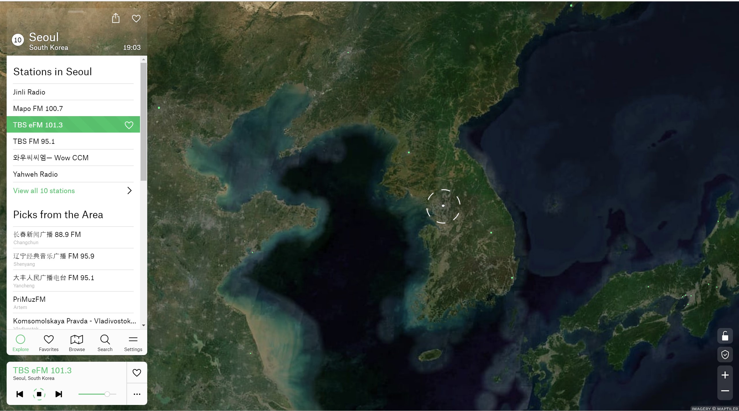 - "Location": 지도에서 원하는 위치를 선택하고 해당 지역에서 방송되는 라디오 방송국을 들을 수 있습니다. 지역을 선택하면 해당 지역에서 방송되는 모든 라디오 방송국이 표시됩니다.