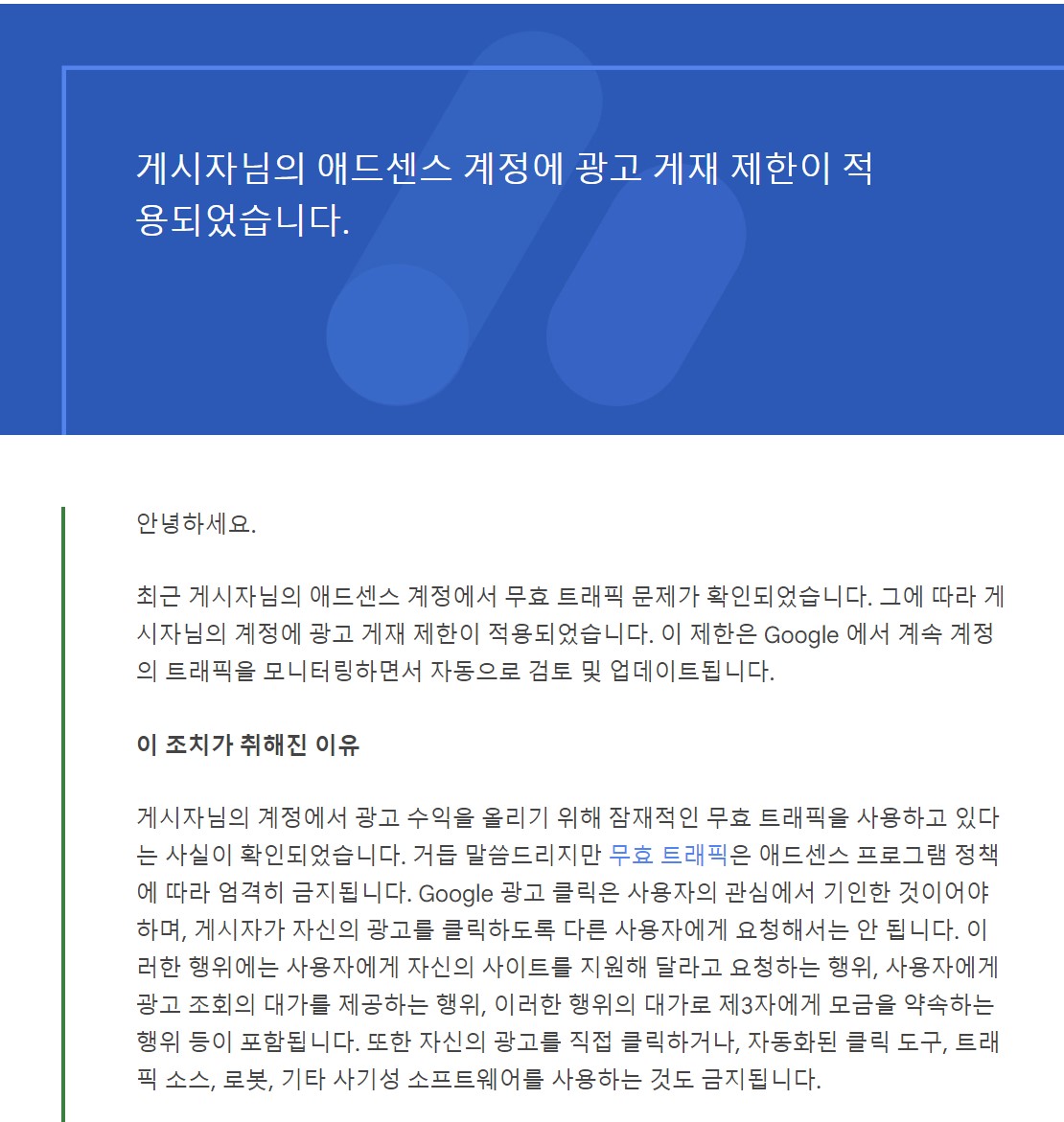게시자님의 계정에서 광고 수익을 올리기 위해 잠재적인 무효 트래픽을 사용하고 있다는 사실이 확인되었습니다. 거듭 말씀드리지만 무효 트래픽은 애드센스 프로그램 정책에 따라 엄격히 금지됩니다. Google 광고 클릭은 사용자의 관심에서 기인한 것이어야 하며, 게시자가 자신의 광고를 클릭하도록 다른 사용자에게 요청해서는 안 됩니다. 이러한 행위에는 사용자에게 자신의 사이트를 지원해 달라고 요청하는 행위, 사용자에게 광고 조회의 대가를 제공하는 행위, 이러한 행위의 대가로 제3자에게 모금을 약속하는 행위 등이 포함됩니다. 또한 자신의 광고를 직접 클릭하거나, 자동화된 클릭 도구, 트래픽 소스, 로봇, 기타 사기성 소프트웨어를 사용하는 것도 금지됩니다.