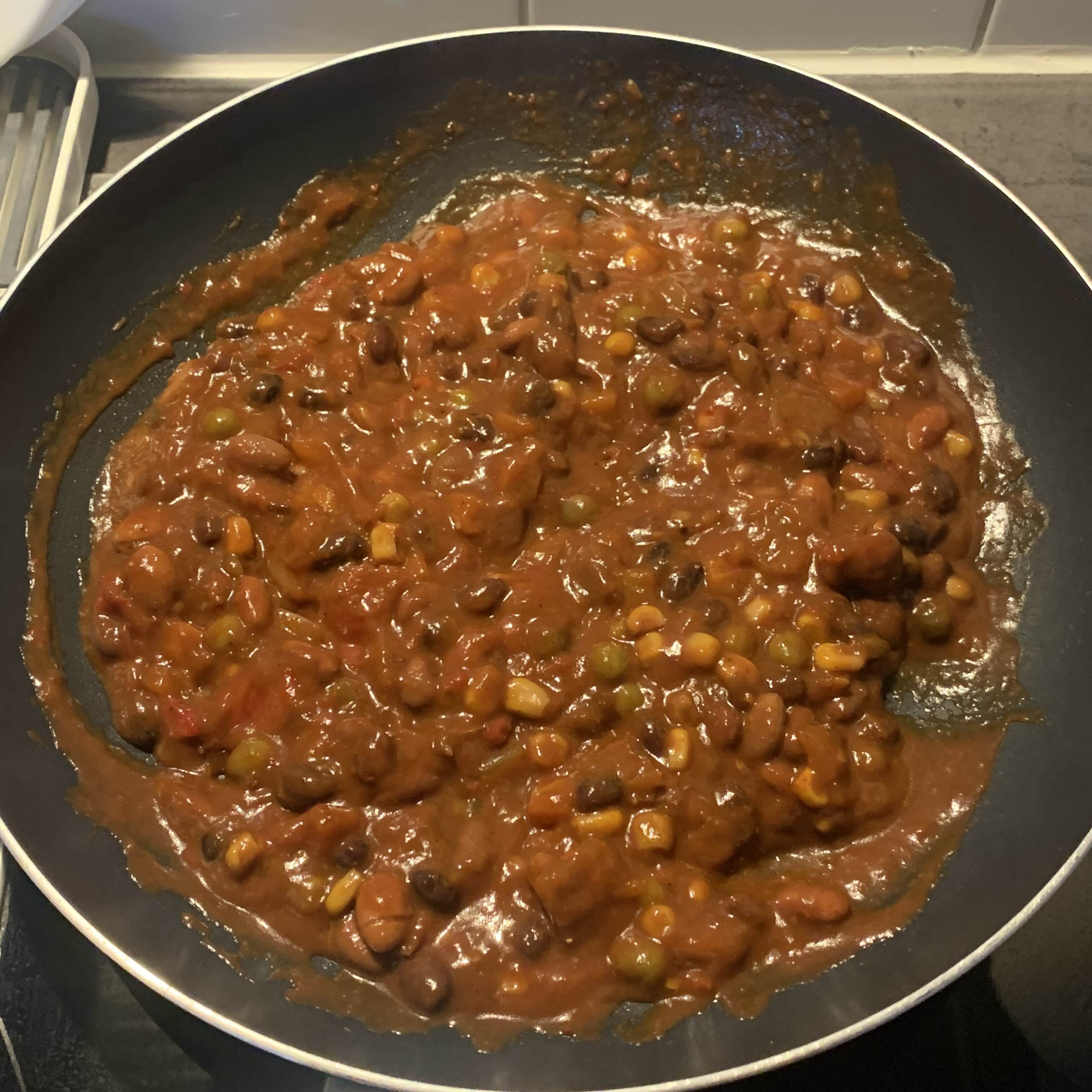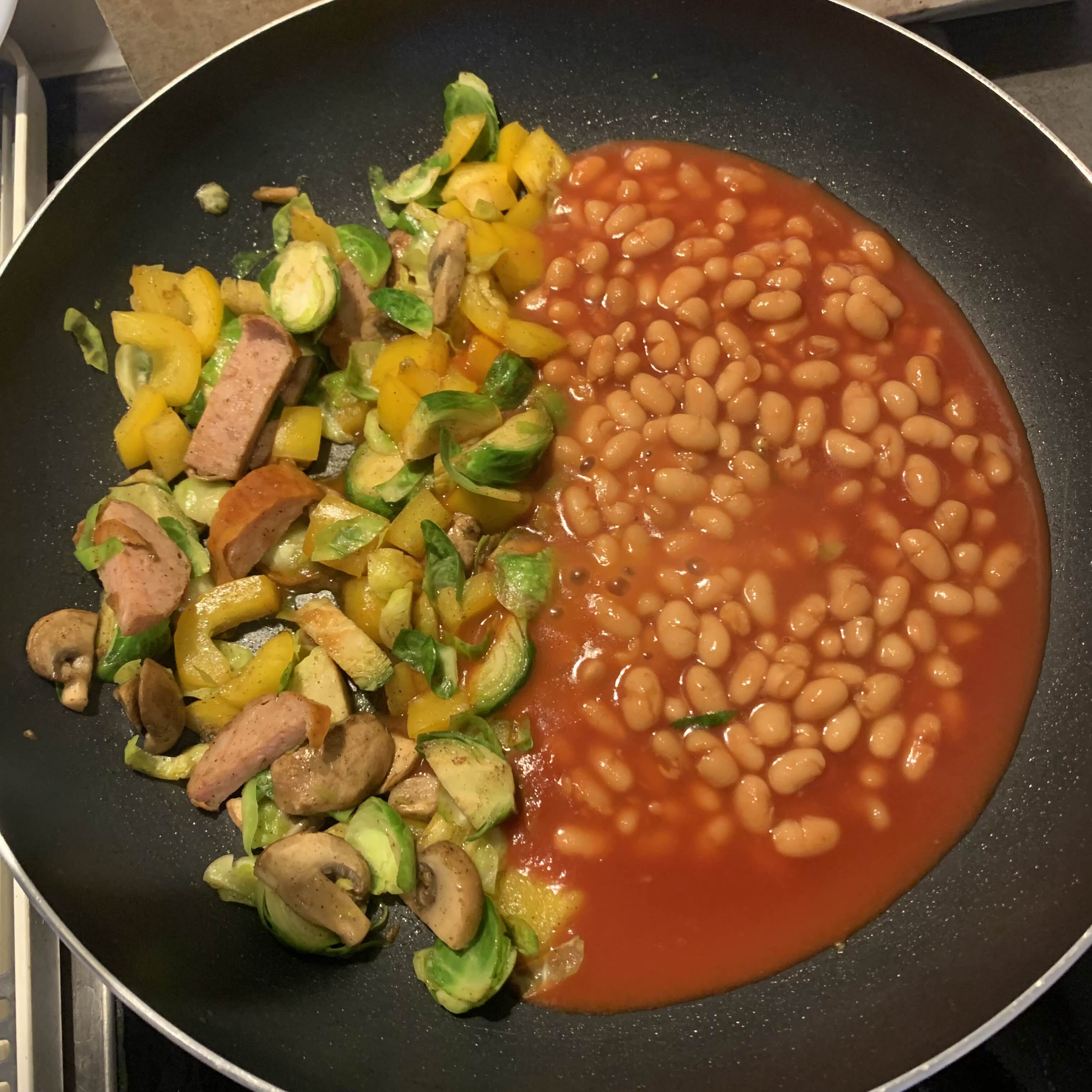 - 별도의 소스팬에 베이크드 빈즈를 데워줍니다.