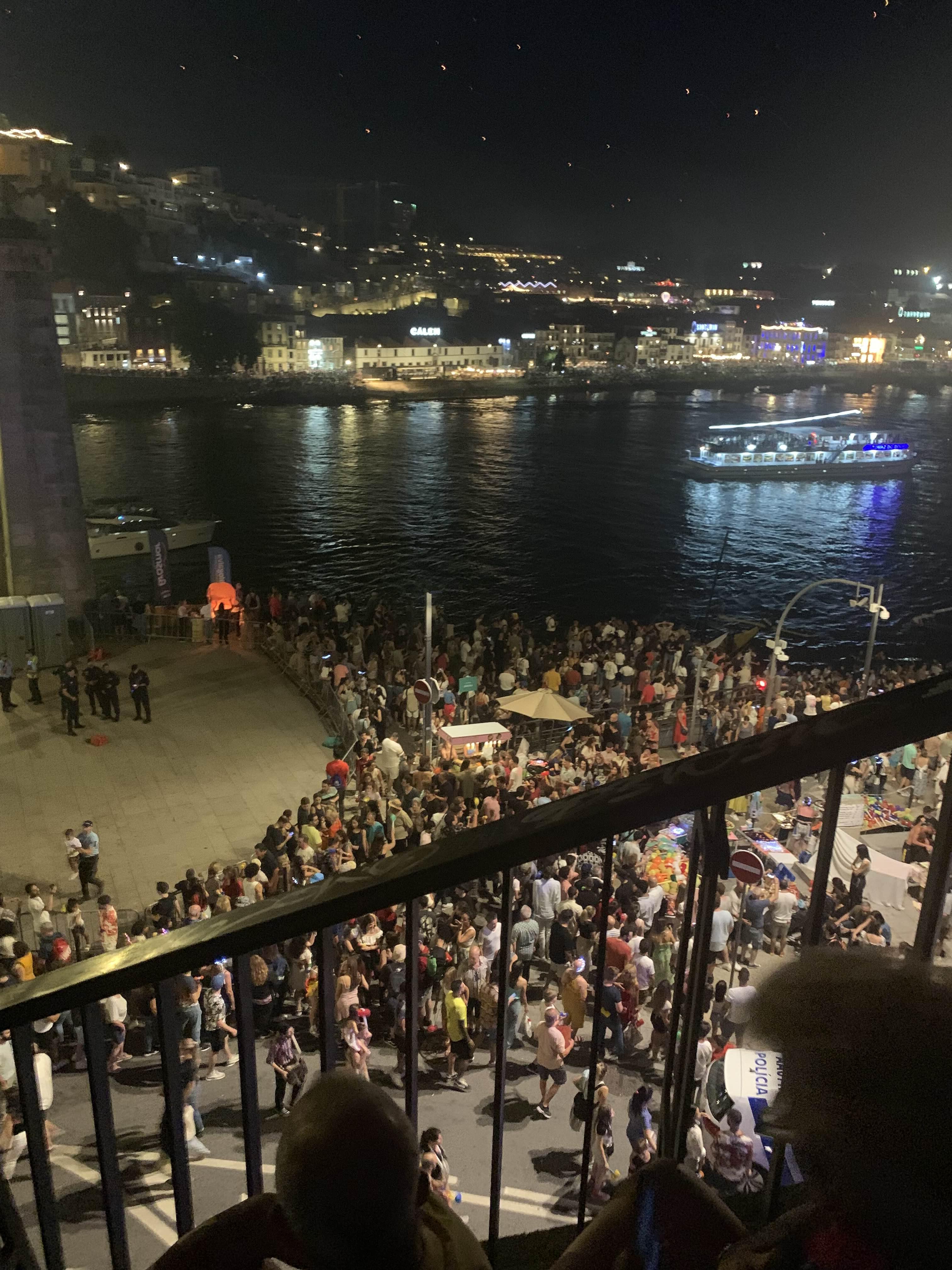 자정에 Douro 강 에서 화려한 불꽃놀이가 열립니다 . 강둑은 이 쇼를 보려는 사람들로 가득 차 있습니다.
