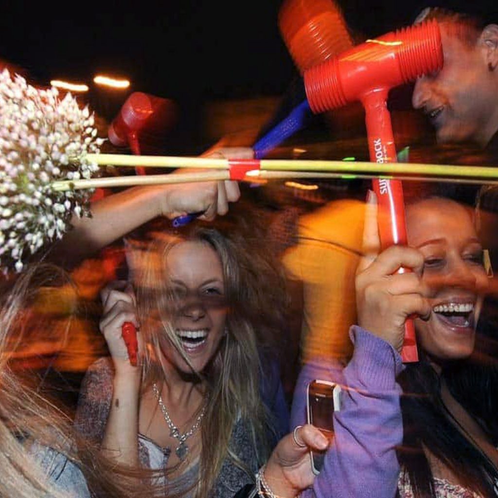 축제의 가장 흥미롭고 유쾌한 요소는 풍선 망치( martelos de São João )와 마늘 꽃( alho-porro ) 의 사용입니다 . 예, 당신은 그것을 올바르게 읽었습니다! 포르투의 거리는 부드러운 망치로 서로의 머리를 쿡쿡 찌르고 얼얼한 마늘꽃을 얼굴에 대고 흔드는 사람들로 가득하다. 이 기발한 전통은 부추 부케와 부드러운 롤빵과 관련된 고대 이교도 의식에서 발전한 것으로 여겨집니다. 시간이 지남에 따라 이것들은 오늘날 우리가 보는 훨씬 더 새로운 망치와 마늘 꽃으로 대체되었습니다.