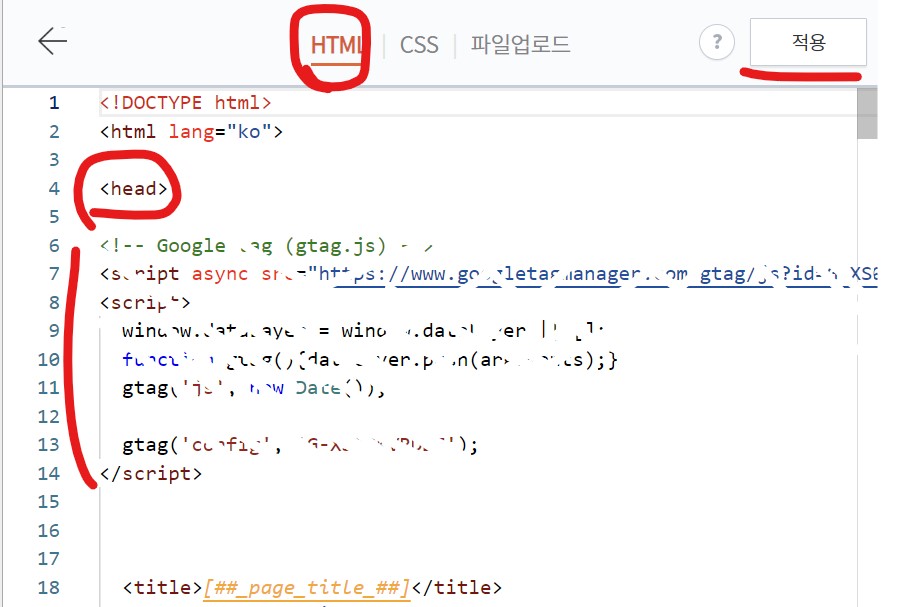 이제 HTML의 <head> 바로 뒤에 붙여넣기 하시고 저장하시면 연동됩니다!