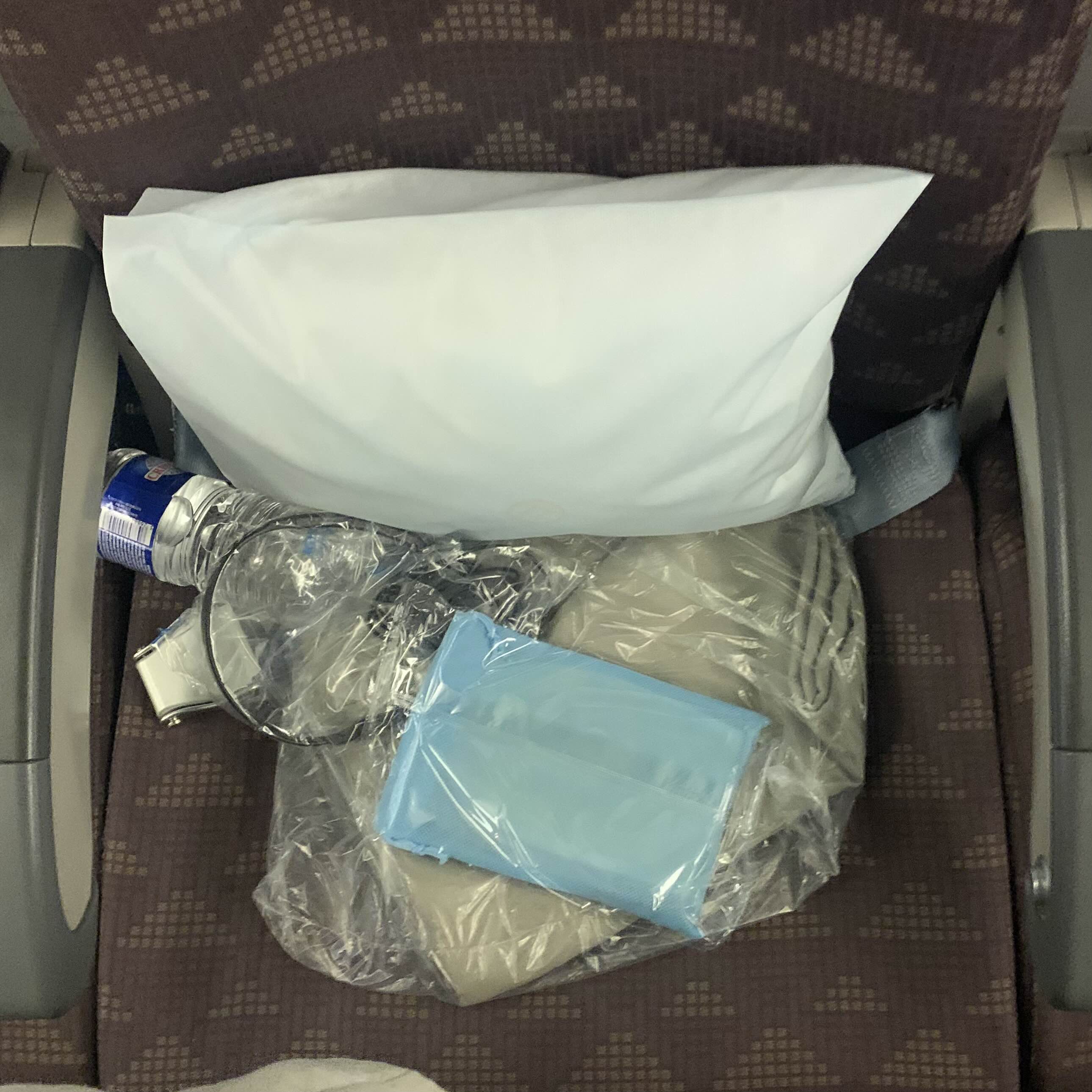 기본으로 쿠션+담요+파란색파우치 안에 슬리퍼와 치약/칫솔+물이 놓여져있습니다!