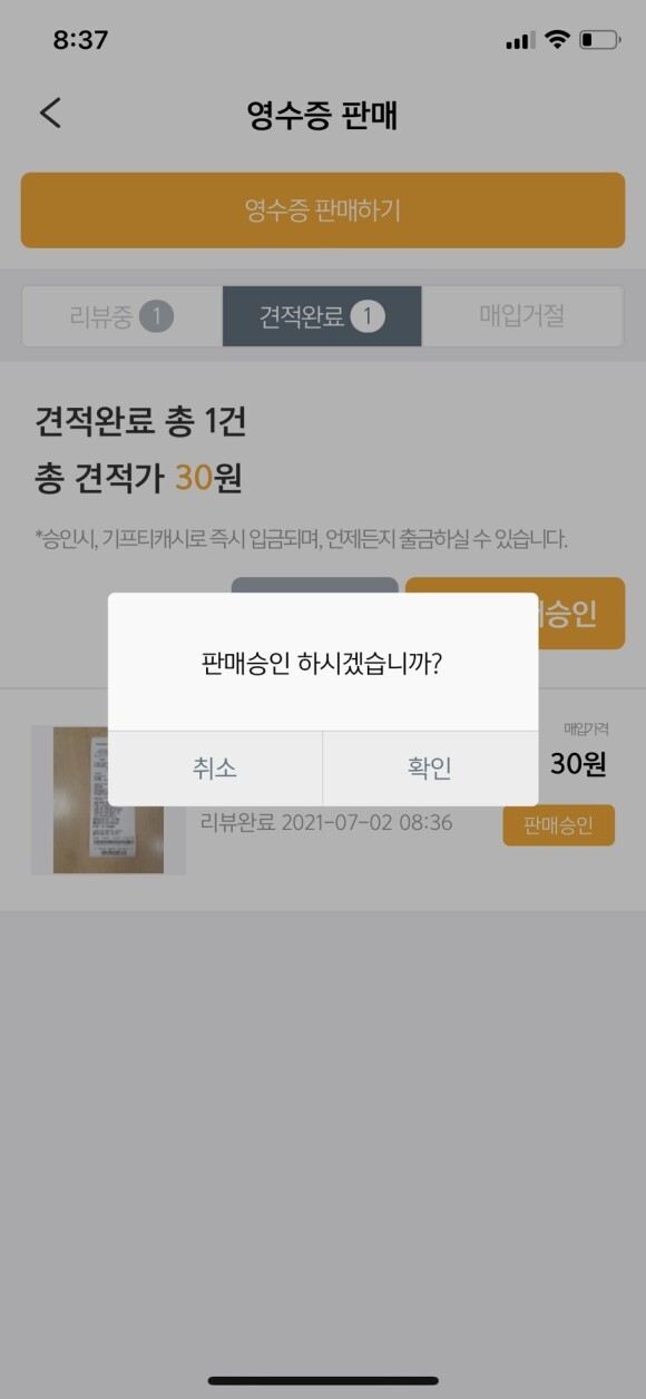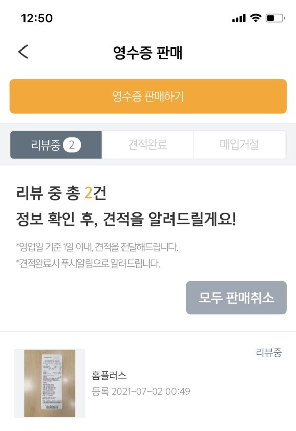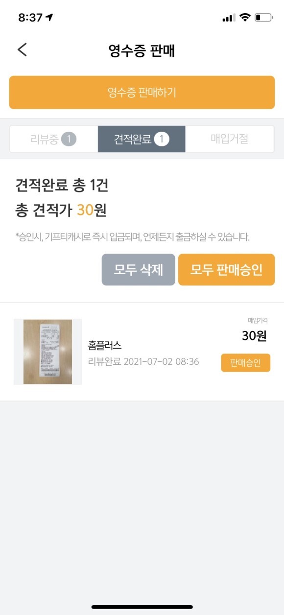 미리 핸드폰 기본 카메라로 영수증을 찍어놓아야합니다.