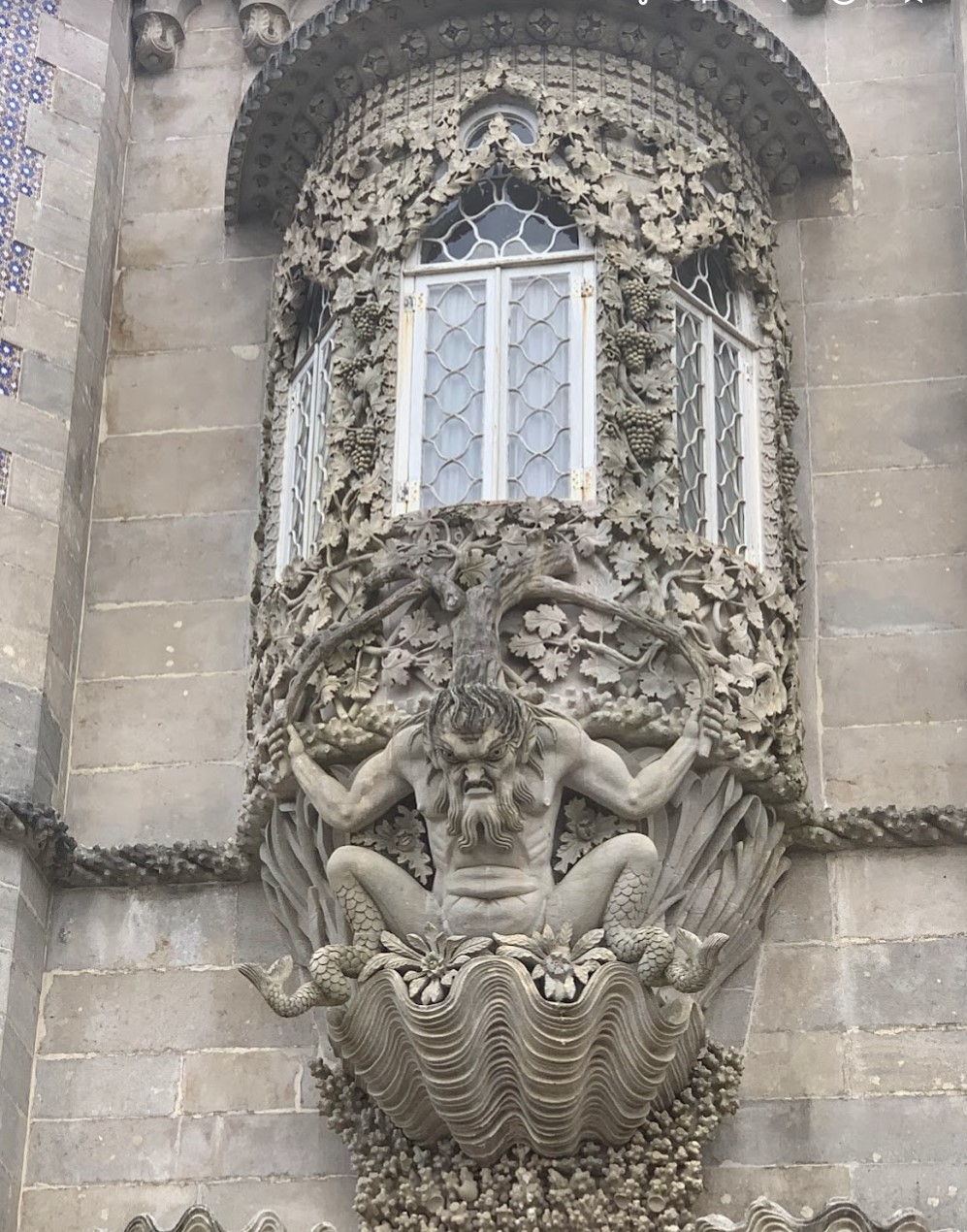 트리톤(Triton)은 반은 사람이고 반은 물고기인 신화 속 괴물이다. 괴물과 마찬가지로 그것이 위치한 현관은 수중 세계와 지상 세계로 나누어져 있습니다. 수중 세계는 아래층에 있습니다. 신고딕 양식의 아치는 세 개의 조개 껍질을 지탱하는 산호로 장식되어 있으며 그 중 하나에는 트리톤이 자리잡고 있습니다. 위에서 우리는 트리톤의 머리에서 자라는 나무가 보이는 지상 세계로 이동합니다. 그 나무는 괴물이 지지하는 것처럼 보이는 퇴창 전체를 덮고 있는 덩굴로 둘러싸여 있습니다.