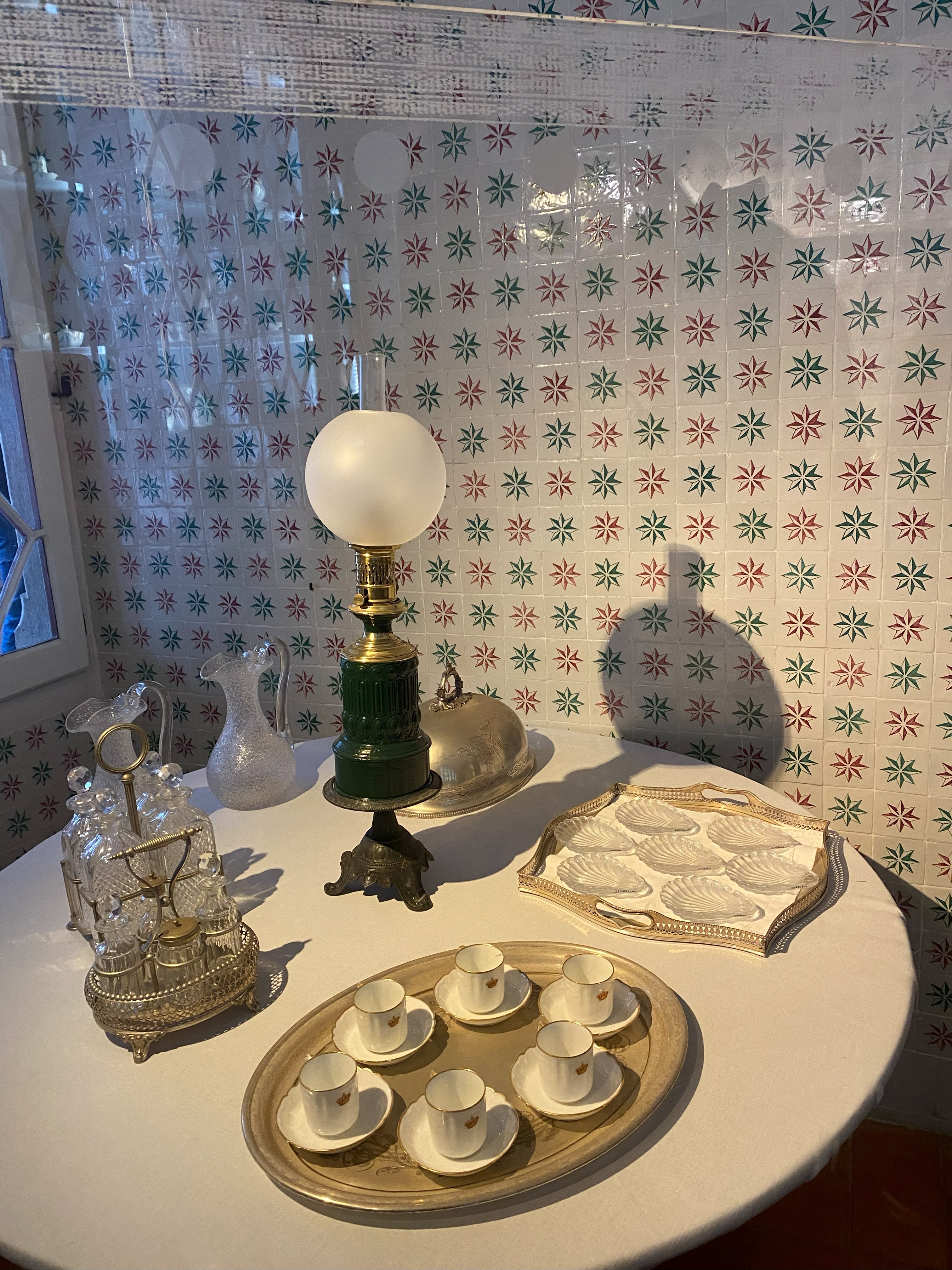 식료품 저장실에 있는 찬장에는 왕의 모노그램이 있는 D. Fernando II(19세기)의 두 가지 서비스가 있습니다. 하나는 Vista Alegre에서 바다 녹색 줄무늬가 있고 다른 하나는 세비야 Pickman에서 파란색 줄무늬가 있습니다. 중앙에는 D. Carlos I의 통치 기간에 의뢰된 백자 도자기로 제작된 Limoges(Haviland) 서비스가 있습니다.