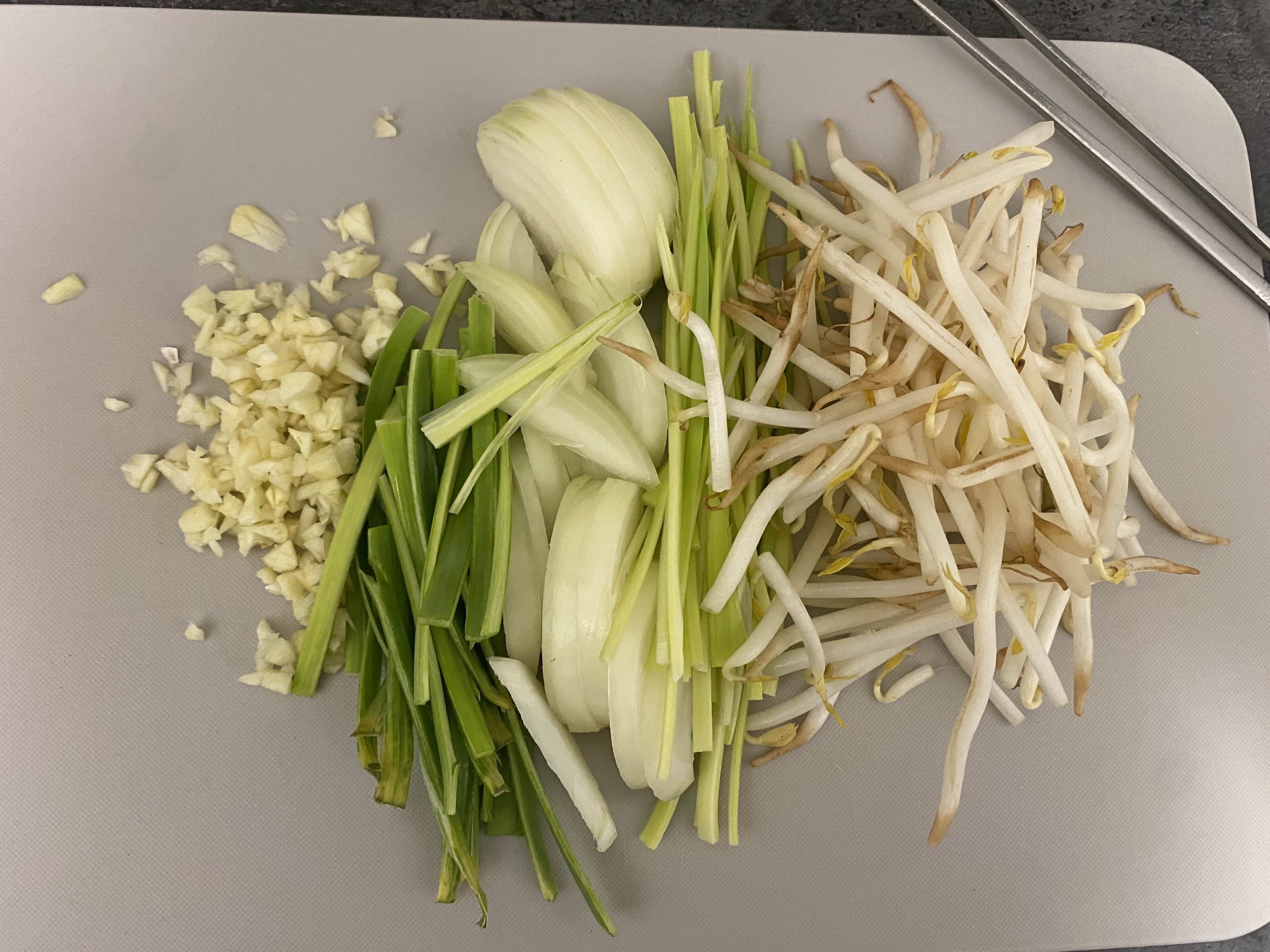 - 피망과 대파를 채 썰어 팬에 넣고 볶아주세요.