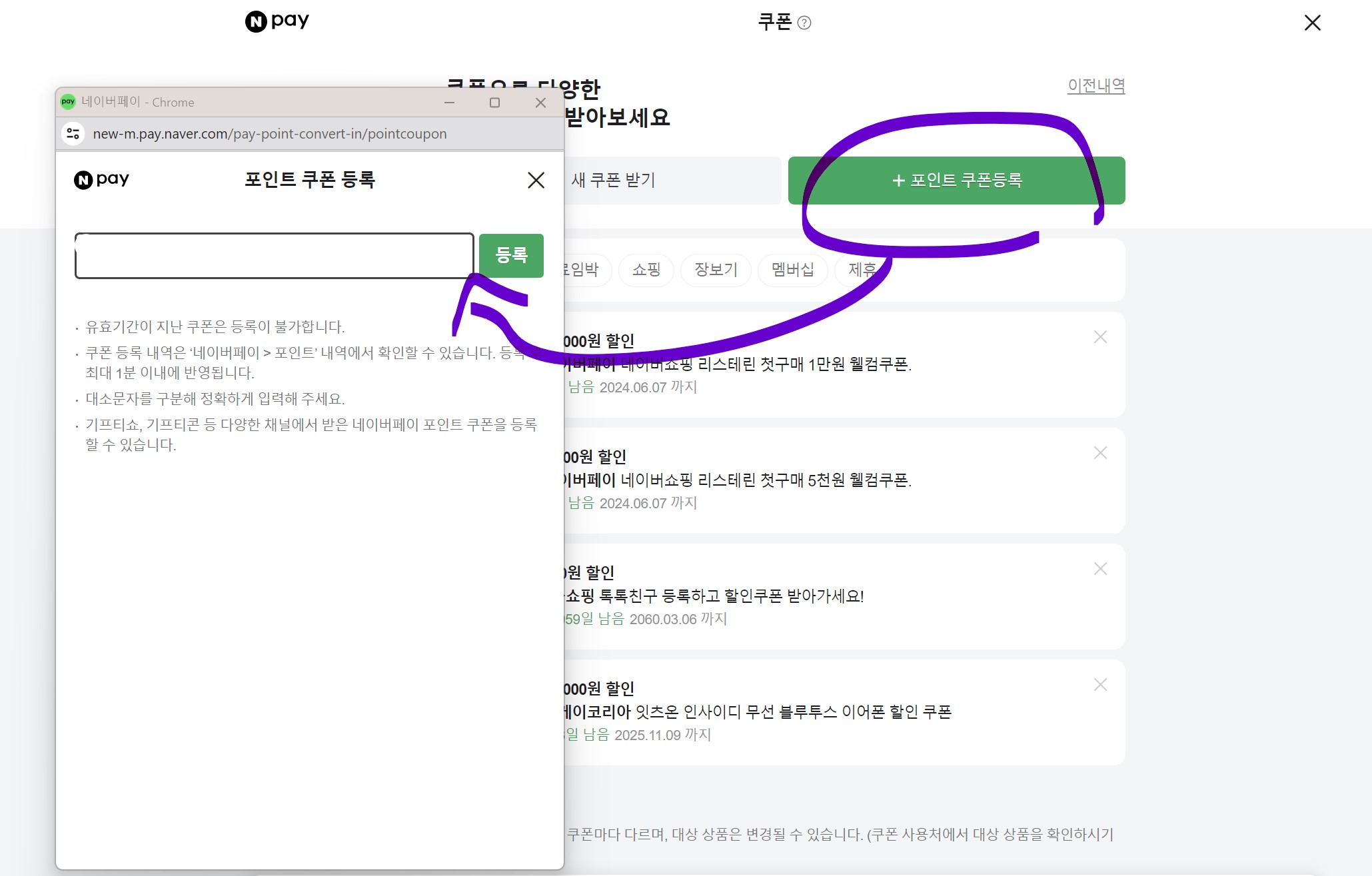 3. 포인트 쿠폰등록을 누르면 새로운 창에 쿠폰을 등록하는 창이 하나더 생깁니다.