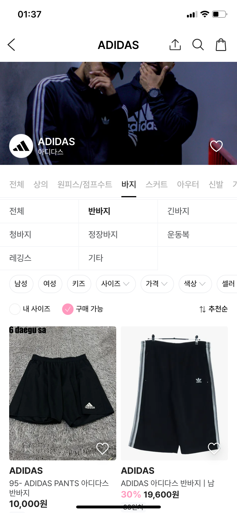 아디다스를 클릭하면 여기서 또 세부 카테고리별로 쉽게 필터링할 수 있어서