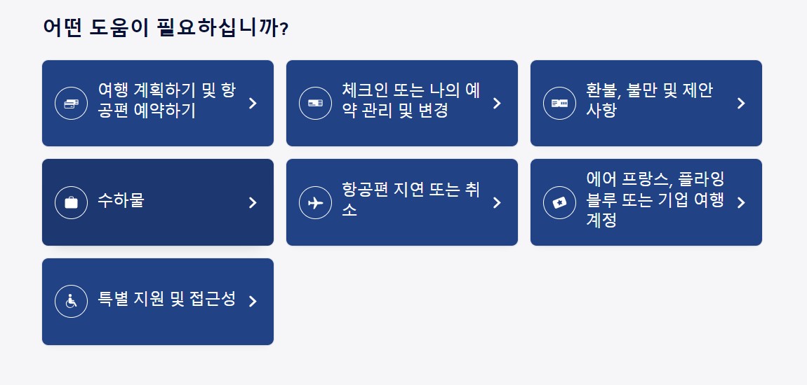 궁금하신 사항이 있으면 에어프랑스 고객 서비스 부서에 문의하시거나 에어프랑스 웹사이트의 질문과 대답(FAQ) 섹션을 참조하시기 바랍니다.