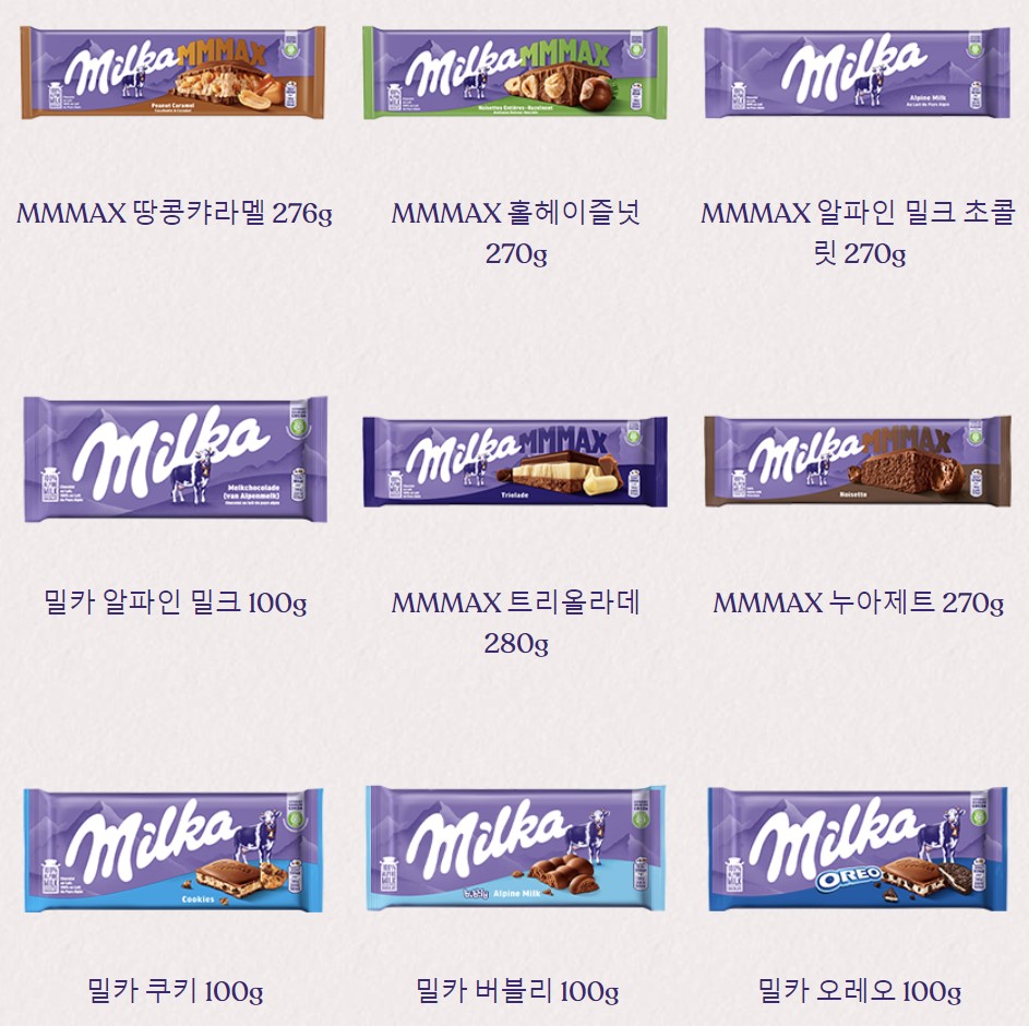 - Milka Alpine Milk Chocolate: 클래식 밀크 초콜릿으로, 부드럽고 달콤한 맛이 특징입니다.