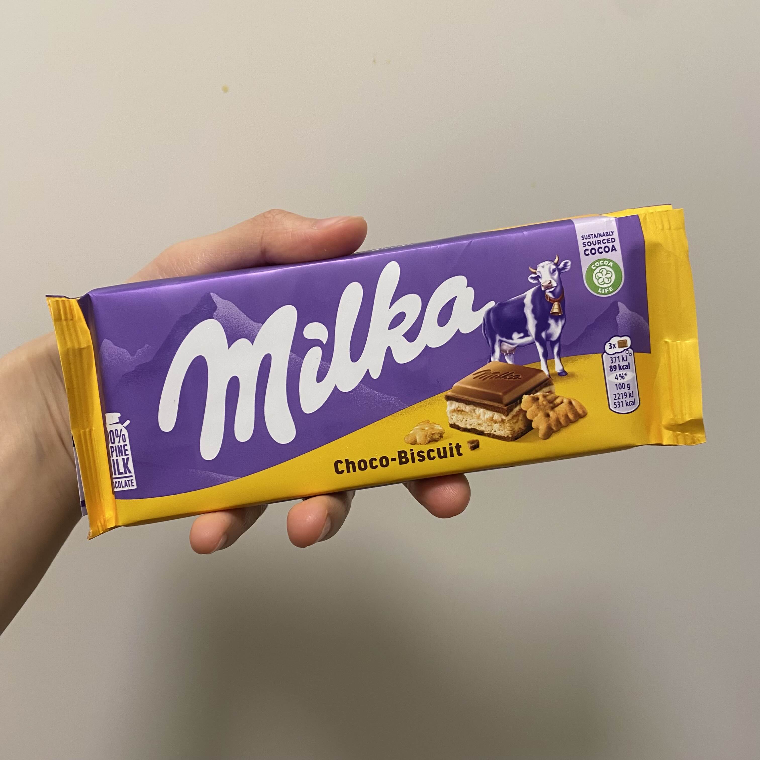 밀카 초코 비스킷은 맛있는 밀카 알파인 밀크 초콜릿으로 덮인 밀크 크림 층이 있는 바삭한 비스킷 태블릿입니다.