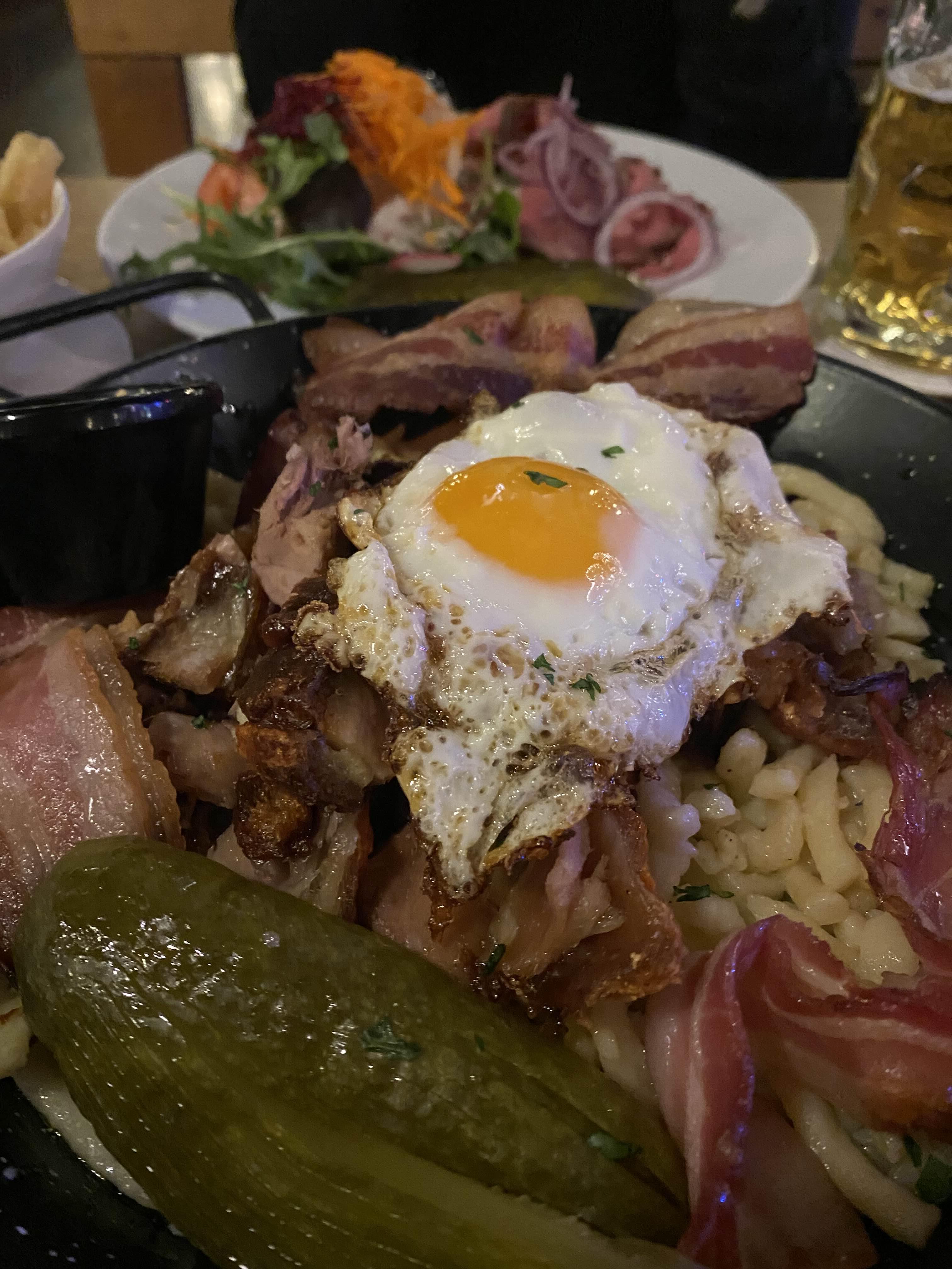 학센이 잘려져서 나오고 거기에 베이컨 계란후라이 피클 + 아래 파스타 깔려있음