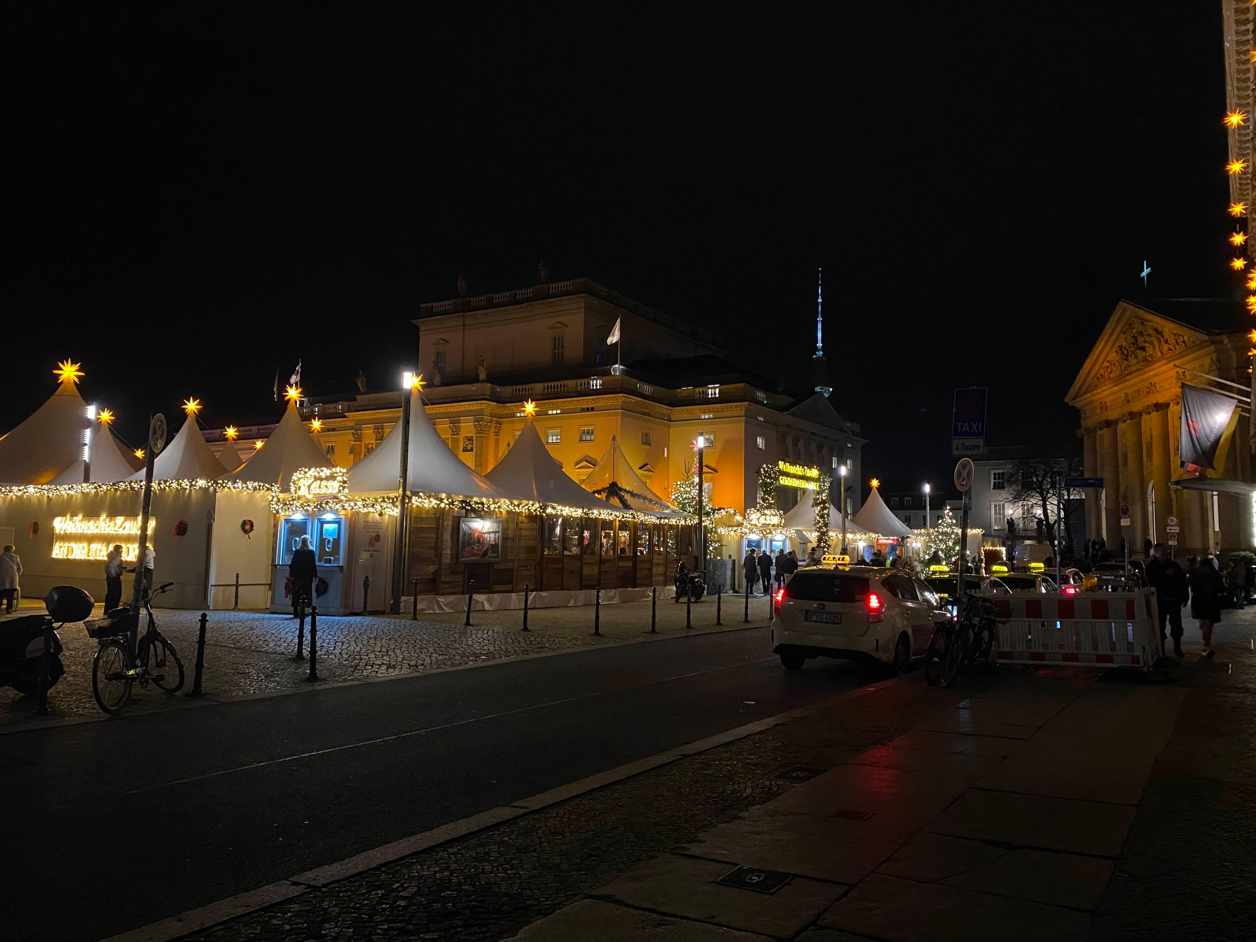매년 크리스마스 마켓은 젠다르멘마크트의 역사적인 장소로 약 80만 명의 방문객을 유치합니다. 공사로 인해 크리스마스 마켓은 2022년부터 2024년까지 인근 베벨플라츠에서 열립니다. 국립 오페라 하우스 , 훔볼트 대학교 법학부, 성 헤드비히 대성당, 호텔 드 로마 사이에서 전통 시장 노점 위의 별이 광장 중앙에 있는 대형 크리스마스 트리와 함께 반짝입니다.