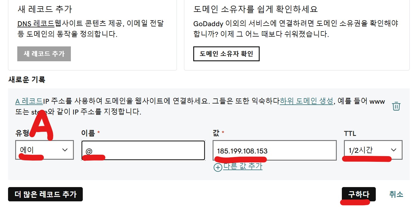 이제 같은 페이지를 보면 깃허브를 -> 도메인사이트(Godaddy)에 연결해줘야한다.