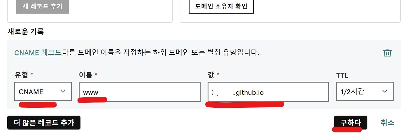 깃허브에는 도메인 주소를 제공해야하고 / 도메인에는 깃허브가 가진 고유 주소를 연결해주면된다!