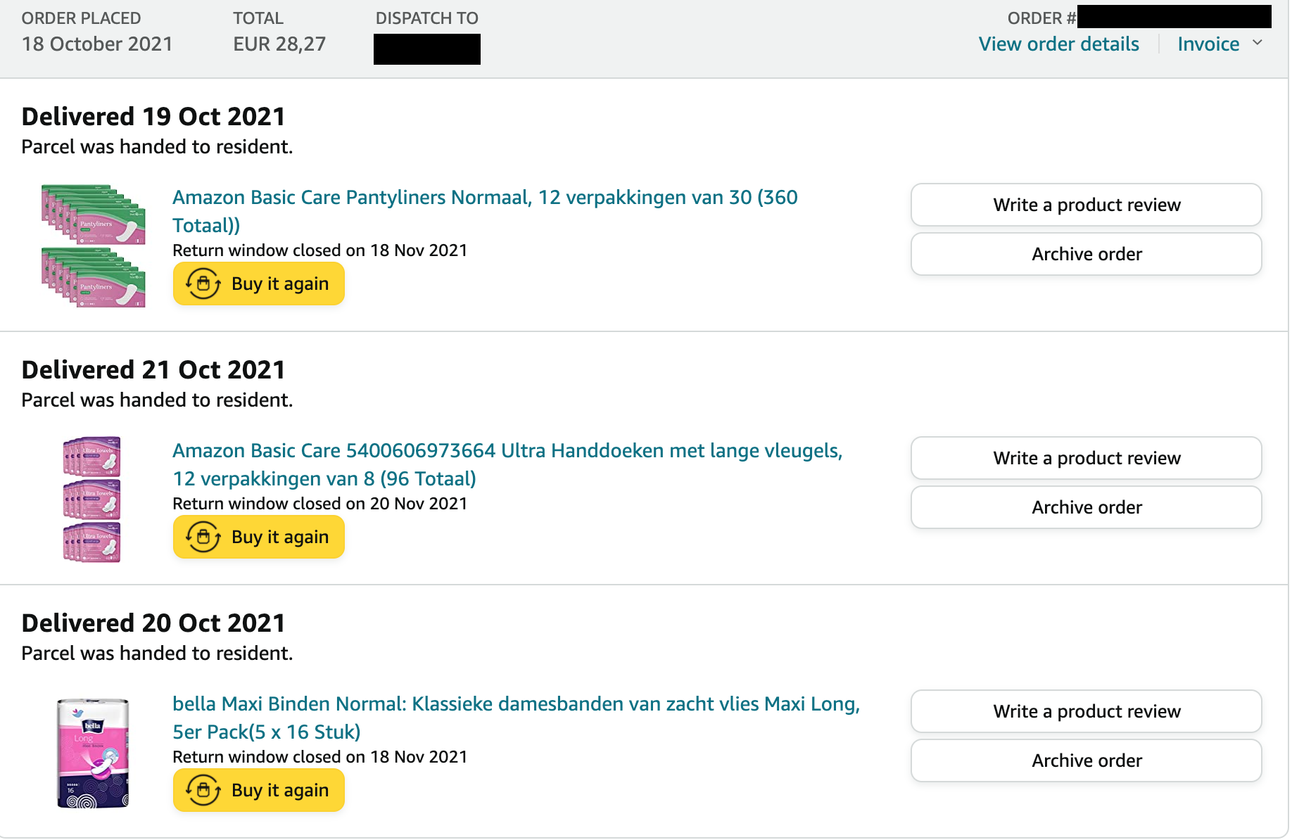 또 생리년이 찾아오고 빡친나는 시발비용으로 대량주문함(총 800장) + 아마존 프라임 무배~ㅎㅎ